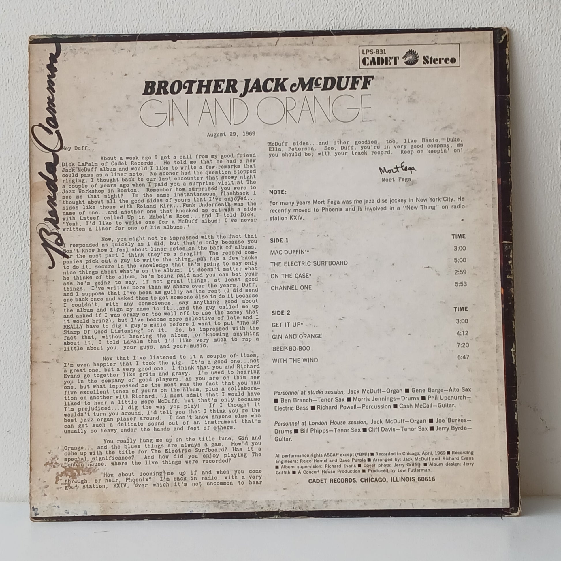 DIsc has a lot of marks and scratches but Plays much better than it looks with mostly light background noise, growing to medium in a couple of patches. Ultrasonically cleaned. Cover has medium/heavy shelf and edge wear and pen on the back and the label.